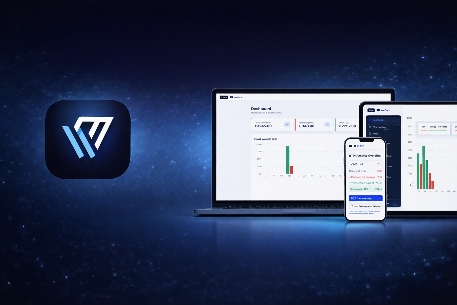 WoCore is een moderne financiële app die ondernemers helpt om eenvoudig overzicht te houden over hun inkomsten, uitgaven en administratie. Geen ingewikkelde boekhoudprogramma’s, maar een duidelijke en gebruiksvriendelijke omgeving waarin alles samenkomt.